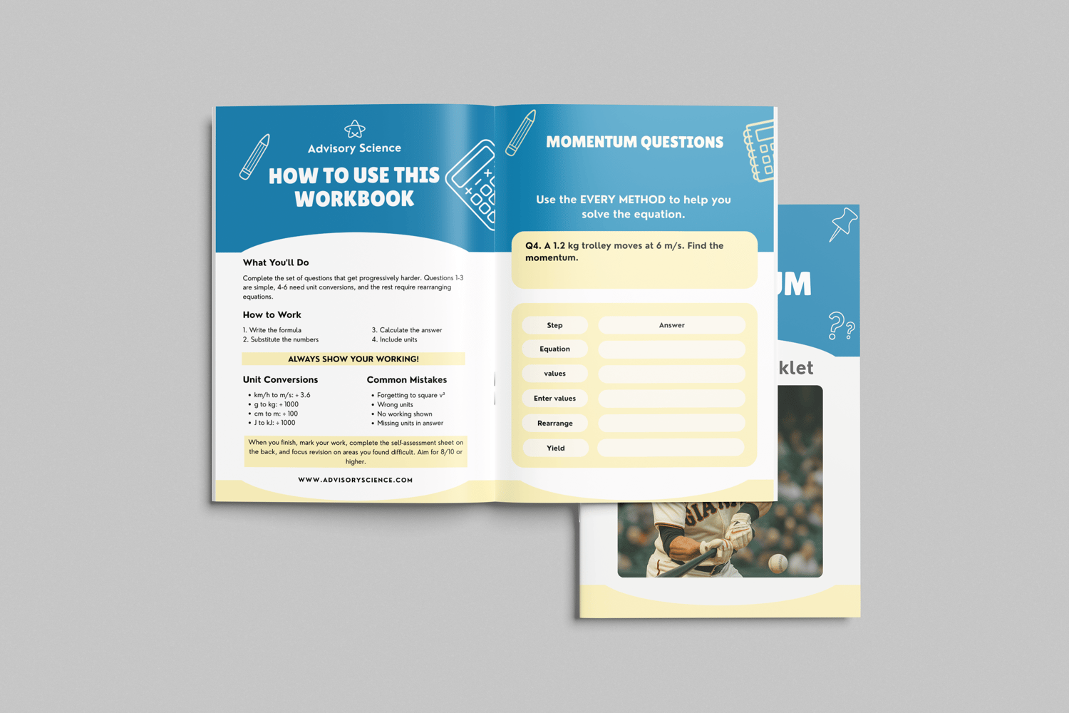 Is your child struggling with Momentum calculations in GCSE Physics? This practice workbook builds confidence step-by-step with 20 scaffolded questions, progressing from guided examples to full exam-style problems. Each question uses the EVERY Method — a structured approach to physics calculations that breaks every problem into manageable steps. Includes fully worked solutions so your child can check their own understanding. Written by an award-winning physics educator whose resources are used in 100+ schools.