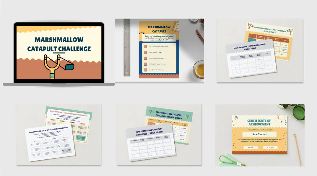 Build a working catapult from simple materials and test how far marshmallows fly — a brilliant introduction to forces, energy transfer and projectile motion. This kit includes a parent guide, build instructions, a measuring record sheet, and the physics explained in child-friendly language. Children design, build, test and improve their catapult through real engineering iteration. Created by an award-winning science educator trusted by families and 100+ schools.