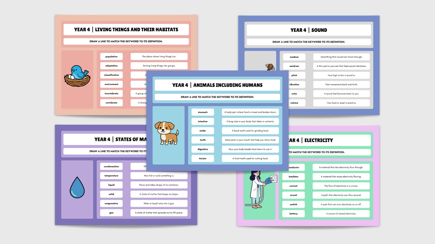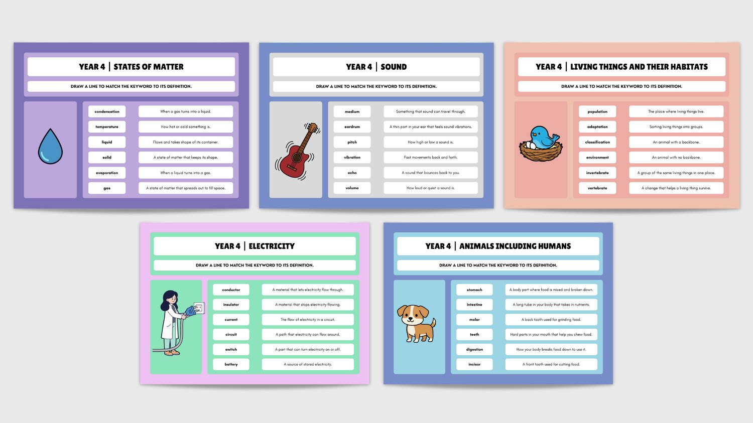 Year 4 science vocabulary matching worksheets covering all units in the national curriculum. Children match key scientific terms to their definitions — building the precise vocabulary needed for assessments and scientific writing. Fully editable in Canva so you can customise to match your topic sequence. A proven retrieval practice strategy that strengthens long-term recall. Created by an award-winning educator trusted by 100+ schools. Save up some money by purchasing the KS2 Science Vocabulary & Keyword Match Collection (Years 3-6) Bundle