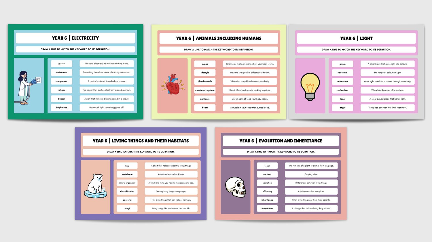 Year 6 science vocabulary matching worksheets covering all units in the national curriculum. Children match key scientific terms to their definitions — building the precise vocabulary needed for assessments and scientific writing. Fully editable in Canva so you can customise to match your topic sequence. A proven retrieval practice strategy that strengthens long-term recall. Created by an award-winning educator trusted by 100+ schools. Save up some money by purchasing the KS2 Science Vocabulary & Keyword Match Collection (Years 3-6) Bundle