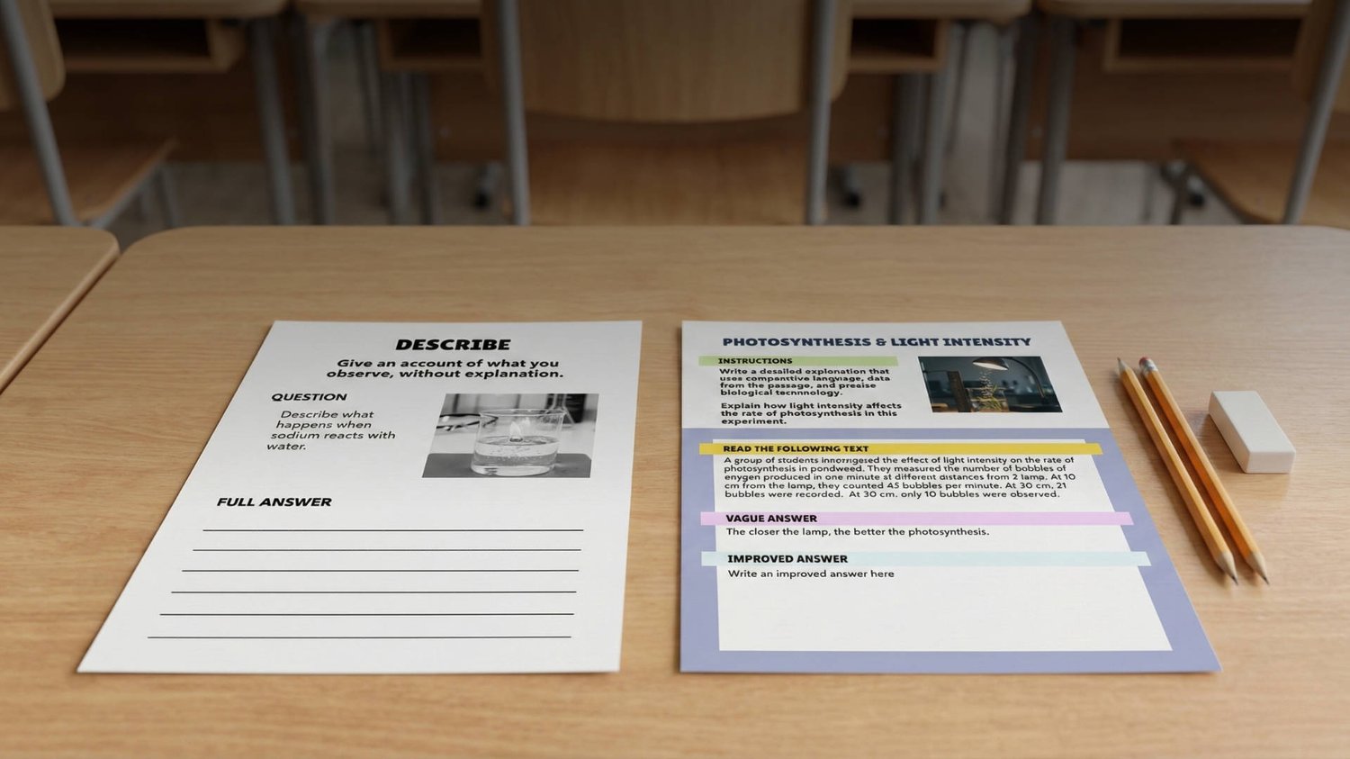 The GCSE Biology Answer Improvement Pack is designed to make examiner expectations visible. Each worksheet presents a typical weak response and guides students through how it can be improved using: